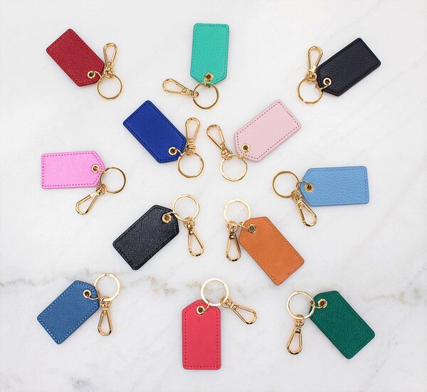 A classic all-leather key chain tab with gold tone dog snap. Add a monogram for a stylish personalized look.